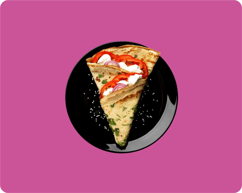 Припек из кунжута и зелени, творожный сыр, помидоры, красный лук