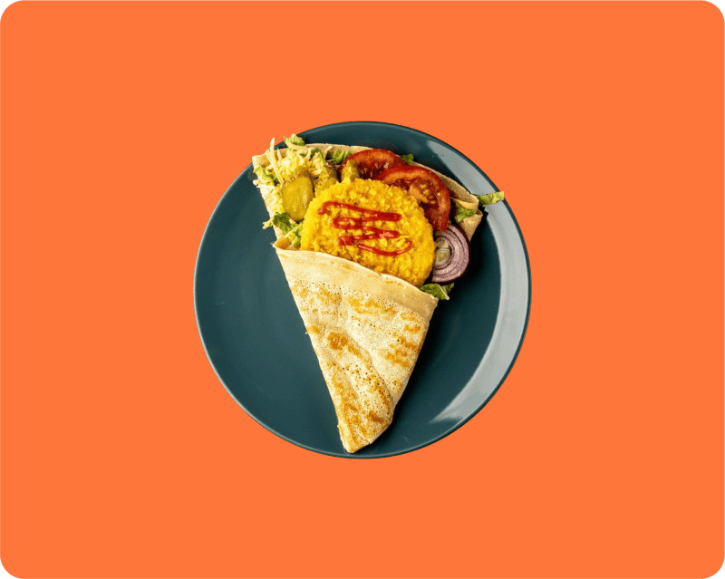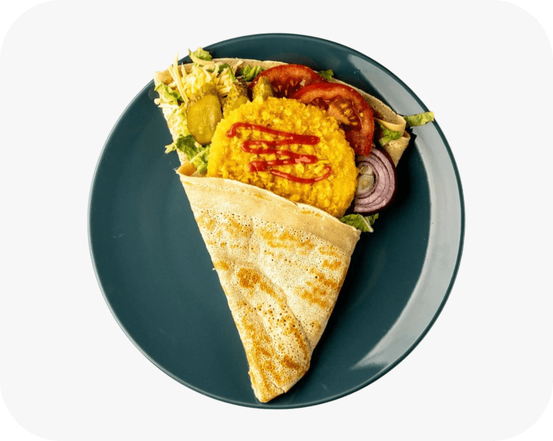 Котлета куриная в панировке, помидоры, соленые огурцы, кетчуп, красный лук, листья салата, сыр
