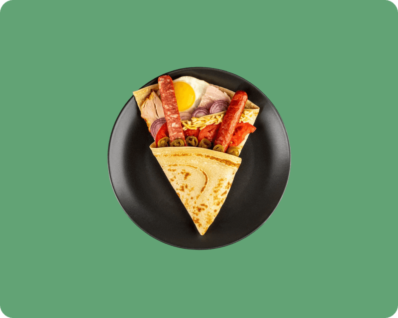 Охотничья колбаска, бекон, буженина, помидор, соус белый, кетчуп, красный лук, 2 яйца, сыр