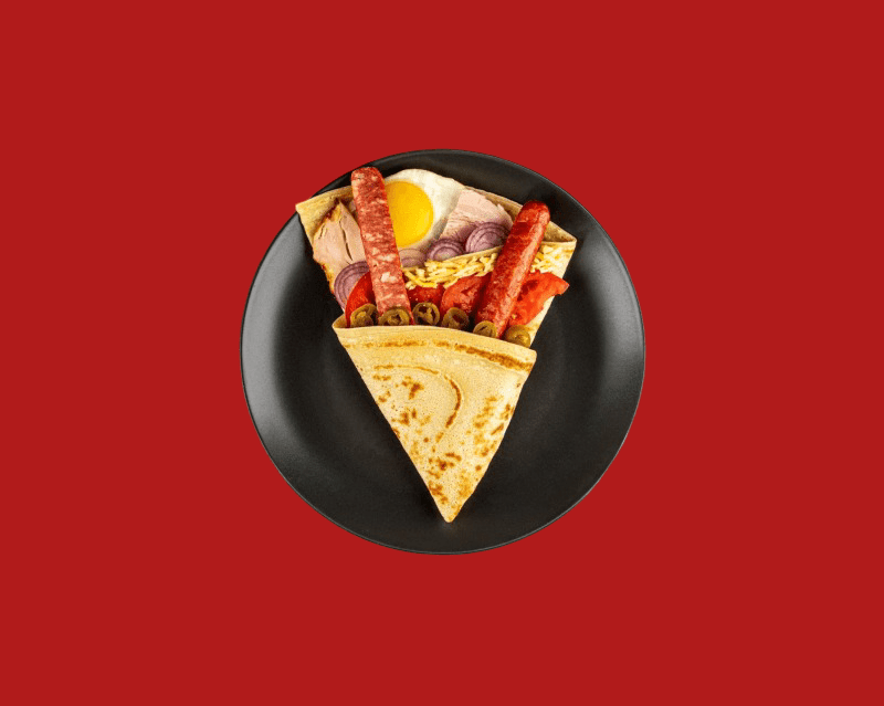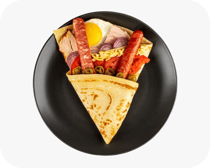 Охотничья колбаска, бекон, буженина, помидор, соус белый, острый соус Шрирача, халапеньо, красный лук, 2 яйца, сыр