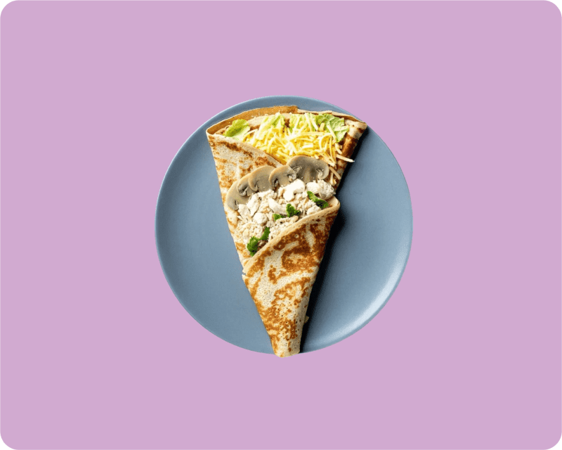 Рубленое куриное филе, грибы шампиньоны, белый соус, пекинская капуста, зелень, сыр