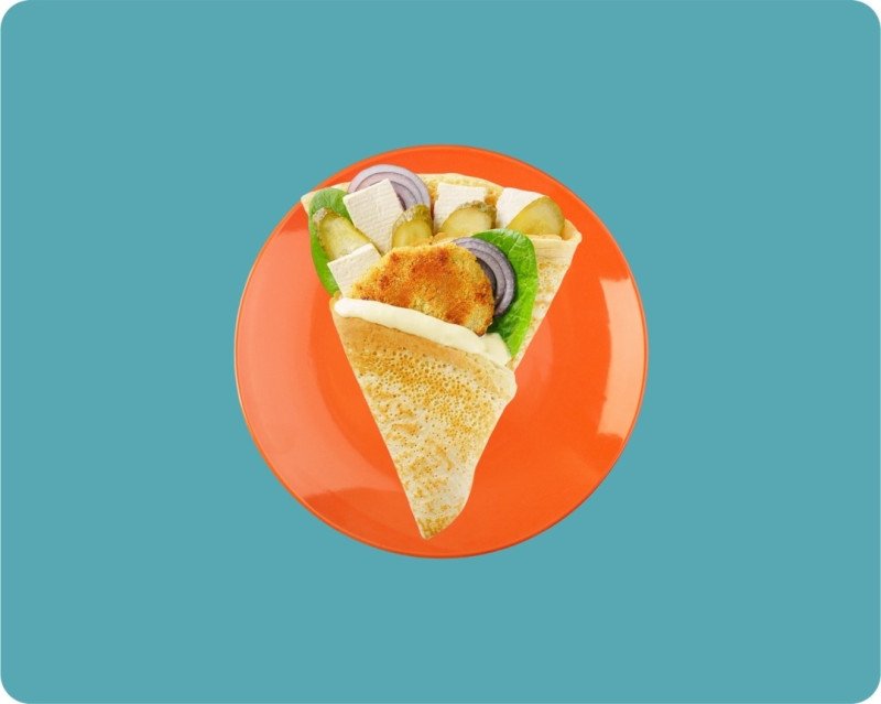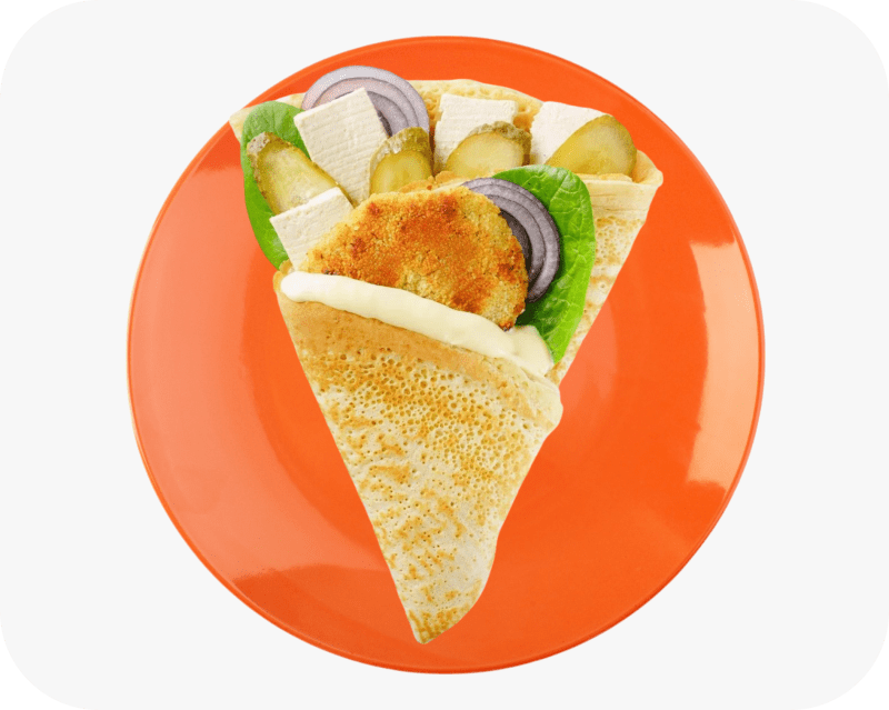 котлета чечевичная, сыр тофу, соленые огурцы, майонез постный, лук красный, салат