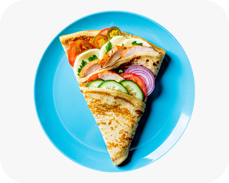 Буженина из курицы, сыр моцарелла, белый соус, огурцы, помидоры, красный лук, перец халапеньо, зелень